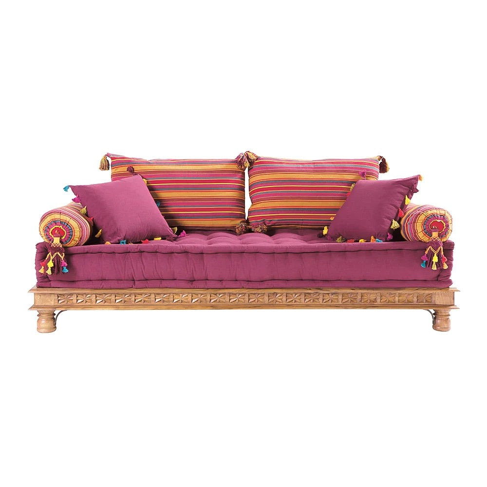 Exude the essence of exotic elegance with this magenta-hued traditional sofa. Crafted with a classic wooden frame featuring intricate carvings, it's adorned with multi-colored striped cushions and coordinating solid throw pillows. Bolster pillows with playful tassels add a whimsical touch. Perfect for a statement piece in a globally-inspired living room.