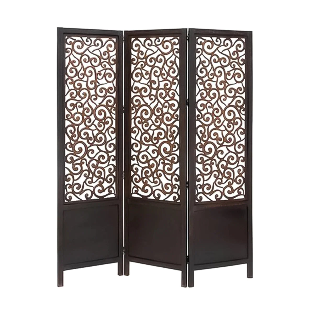 Elevate your decor with the Scroll Screen, which showcases a deep espresso finish adorned with elegant scrollwork. The ornate patterns carved into each panel create a mesmerizing visual effect that doubles as a piece of art. This screen is perfect for those who appreciate the intricate details and desire a functional piece that adds aesthetic value to their space. Its solid construction and easy-to-fold design ensure both durability and convenience.